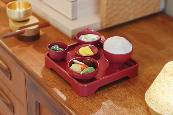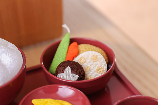 京都のちりめん細工工房にて職人がひとつひとつ手作りしているこの「精進料理Ⅱ」は、食材によって異なるちりめんの質感や、ふっくら丸みのある見た目がとても可愛らしく、お盆が過ぎても飾っておきたくなってしまいます。