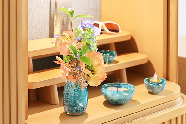 仏壇に花を飾ることは、ご先祖様や仏様へ「感謝の気持ちを表現する」「花の香りを楽しんでいただく」ことになります。また花の美しさは、お参りする方の心にも癒しをもたらします。なによりも大切な故人様をお祀りする仏壇が華やかだと嬉しいですよね。しかしお盆時期の夏はどうしてもお花の痛むスピードが速く、仕事などで家をあけることが多い家庭だとこまめに水を替えることも出来ないため、ものの一瞬で枯れてしまいます。そんな方にはずっと枯れずにきれいなままの花を楽しめる造花「メモリアルフラワー」がおすすめです。虫が寄ってきたり、花粉などで花立の周りを汚すこともなくいつもきれいにしてお使いいただけます。枯れずに使えるので、お財布の負担も軽くなり一石二鳥です!