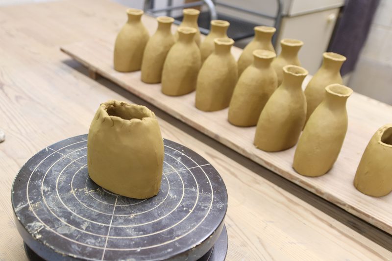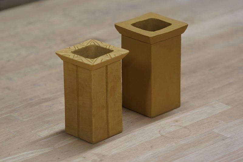 『星宿る』花立の乾燥前と乾燥後を比べると、縮んでいることが一目で分かる。乾燥と素焼きを経ることでサイズが大きく変化するため、成形時には縮む割合を考慮して設計図を検討する必要がある。乾燥後には、表面に模様や絵付けのための下絵を刻んでいく。