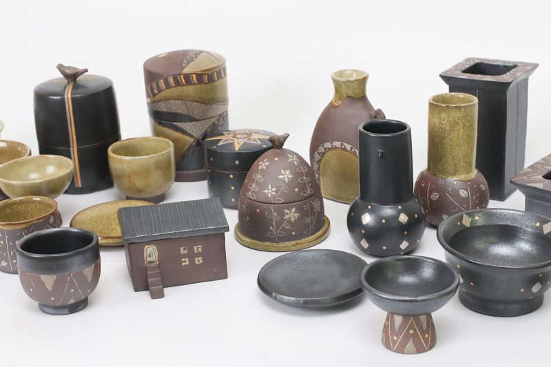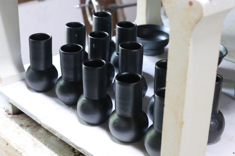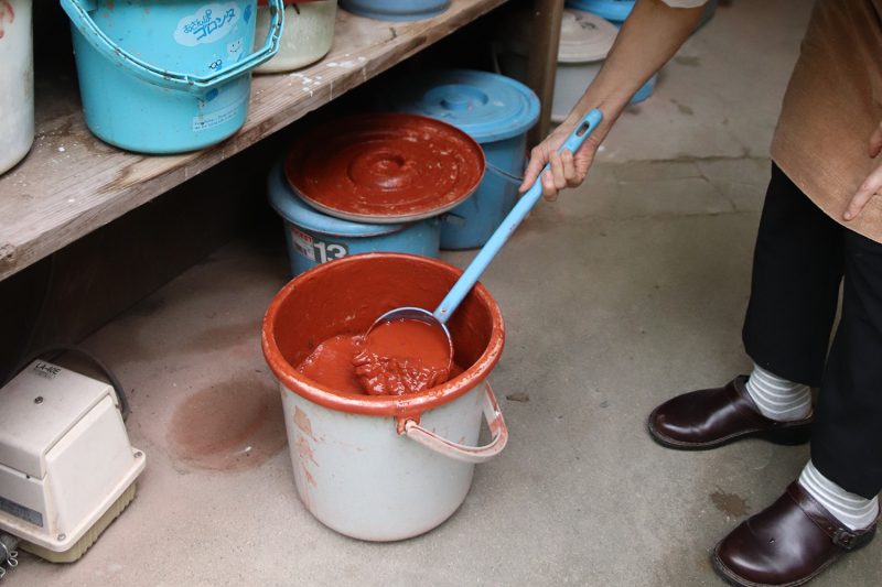 ▲「イコマグロ」と呼んでいる赤い釉薬は焼成して鈍く光る黒色に発色させている。工房の裏山の生駒土を配合。