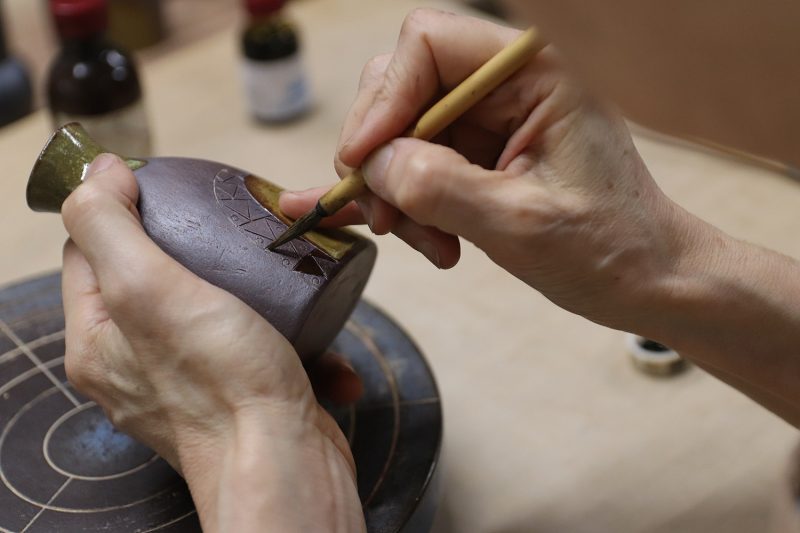▲焼成した陶器への絵付け作業。細い筆を使ってプラチナ彩と金彩で繊細に模様を描く。再び窯で焼き上げると、上品な光沢をもつ金と銀色で模様が浮かび上がる。