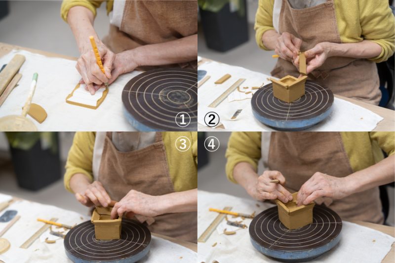 まず、板状にのばした粘土を設計図に沿ってカット。続いて、各面を丁寧に削って角度を出し、箱の形状を整えていきます。あらかじめタタラで成形しておいた器の四隅にパーツを貼り合わせ、さらに削りを加えて全体のバランスを調整していきます。この工程では、繋ぎ目の多い構造ゆえにひび割れが生じやすく、粘土同士をしっかり接着させて強度を保つことが何より重要。