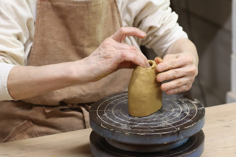 ▲五具足『月明り』の花立の成形作業。こちらの花立は手びねりという、手だけで土をこねて形を作る方法で作られている。