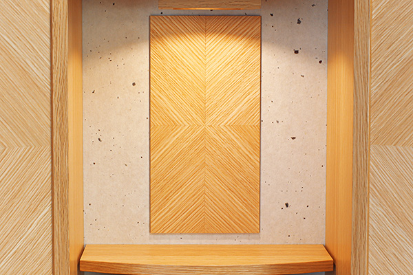 2010年発売のロングセラー商品「セイル ダーク」の新色「セイル ライト」は、突板を弓矢の羽根のように斜めに貼り合わせた「矢貼り模様」が存在感を放つ、インテリアのような仏壇です。この特徴的な模様が船の帆に見えることからセイル(帆)と名付けられました。