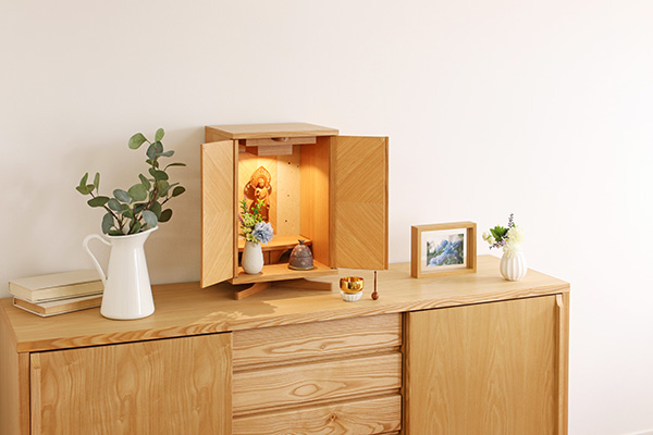また、「セイル ライト」の明るい色味はナチュラルスタイルからモダンスタイルまで幅広く似合います。奥行はわずか25cmとコンパクトなので、チェストやサイドボードなどにも無理なく置くことができ、住空間を圧迫せずお仏壇をより身近な存在としてお祀りいただけます。