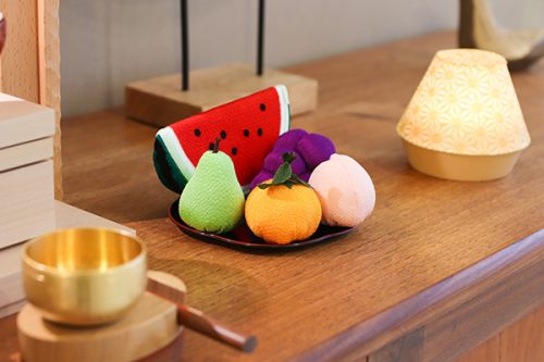 こちらもお盆飾りには欠かせない果物盛りをちりめん素材で表現した商品です。なるべく旬の果物をたくさん用意したい!…とは言えど、これだけの果物を揃えるのは大変ですし、せっかくお供えしたのに少し家を空ければあっという間に痛んでしまいますよね。そんなときに助かるのが「ちりめん飾り 果物盛り」です。鮮やかなちりめん素材の果物が、仏壇まわりを華やかにしてくれます。ふっくらもちもちとした触り心地にもこだわって作られているので、準備するときに是非体感してみてくださいね!