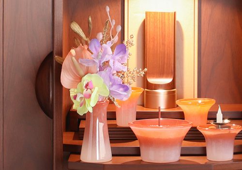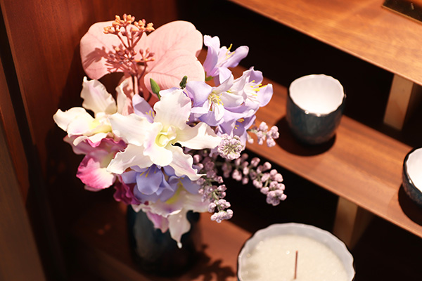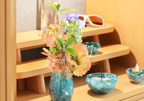 シャーベットカラーのアンスリウムや、明るいゴールドの花材が軽やかで明るい印象を与えます。「スノウ ローズ」のようにツヤ感のあるガラス素材の仏具と合わせていただくと、より季節にマッチしたコーディネートに仕上がります。