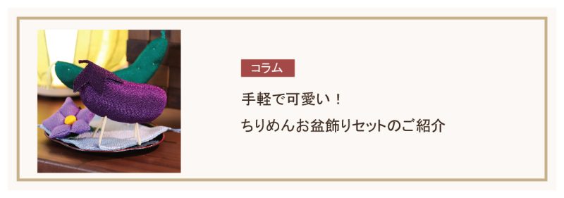 そんな時にオススメなのが、かわいいちりめん素材のお盆飾りです。京都の職人が1つずつ手作りで仕上げるちりめん素材の「精霊馬」や「精進料理」は、色鮮やかで見た目にも可愛く、また触り心地にもこだわっているので触ってもさらに可愛い人気のシリーズです!クーラーを切ってお出かけしても、長い期間置いていても全く問題ありません。おまけに来年も繰り返し使えてとってもエコです。気になった方はぜひ下のバナーからチェックしてみてくださいね。