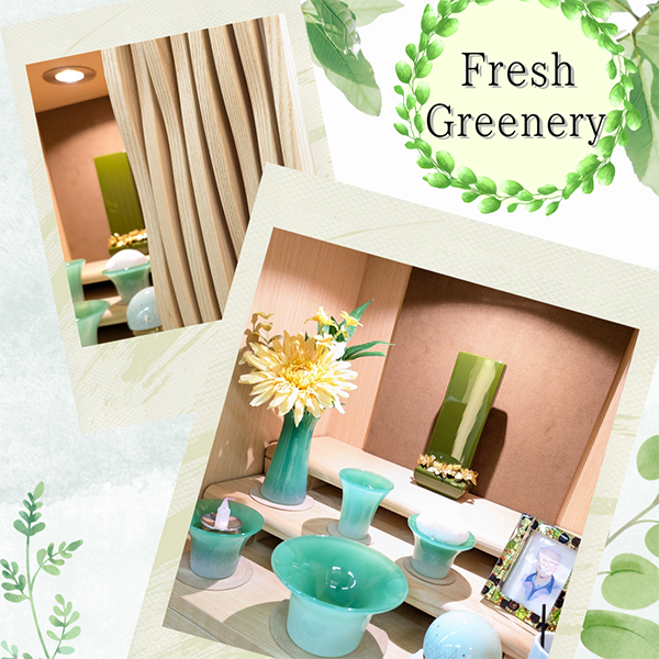 新緑にちなんで、お位牌・お仏具・おりんなどを、緑でまとめたコーディネートにしてみました!