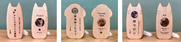 ワンチャン・ネコチャンのシルエットモチーフのかわいい⽊製位牌です。
