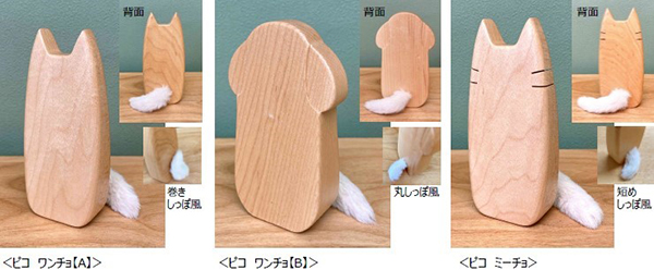 ワンチョA は⽴ち⽿タイプ、ワンチョB は垂れ⽿タイプの⽝モチーフで、ミーチョは猫モチーフです。