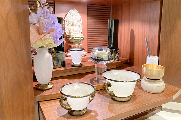 13世紀からイタリアで受け継がれ、作られ続けているヴェネツィアンガラスですが、どちらも当社仏壇とも相性がよく当社仏壇のグレードを更に高めてくれます。淡彩の仏像や当社オリジナルの輪島塗の位牌との組み合わせもおすすめです。伝統と革新が融合された現代仏壇らしい組み合わせですね。