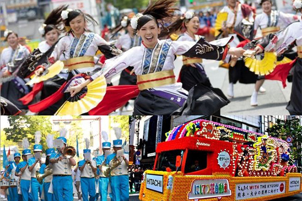 どんたくパレードでは、お着物姿で優雅に舞う女性陣、勇ましくよさこいを群舞する方々、マーチングバンドもありますし、過去には本物の馬に乗った武将に扮した俳優や本場からお越しになったサンバ隊の参加もありました。