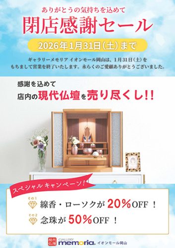 つきましては感謝の気持ちを込めまして、お仏壇をはじめ、線香・ローソク・念珠などの一部商品を特別価格にてご提供する閉店セールを実施いたしております。