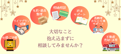 当社では、お仏壇お仏具以外にも「人生サポート」の窓口も行っています。主に、個人では解決することが難しい相続関係、生前・遺品整理、不動産売却・活用など様々なご相談やお見積りを承っております。お気軽にお問合せくださいませ。(無料相談ダイヤル:0120-793-681 受付時間:10時~17時 不定休)