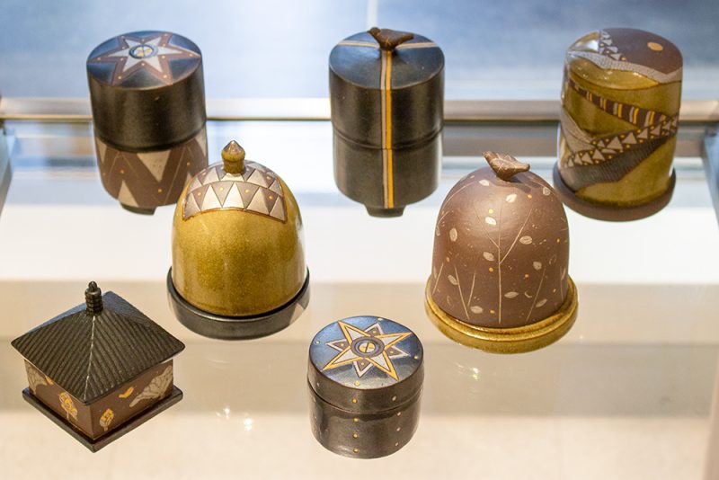 市川先生作の骨壺たち。仏具も含め16種類ございますので、トータルコーディネートもできます。
