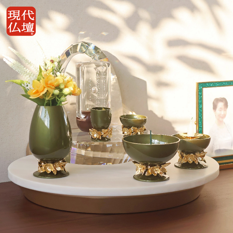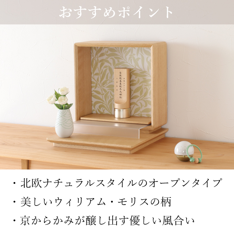 おしゃれなモダン仏壇です。リビングやマンションに置きやすく、インテリアに馴染む小さいオープンタイプ。日本製ならではの風合いを持つ京からかみに北欧デザインを組み合わせました。