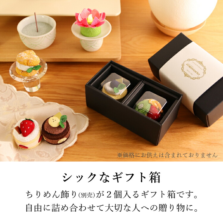 ギフト箱(ちりめん飾り 2個用) ▼ 価格・仕様を見る 画像をクリックすると切り替わります 価格・仕様 商品名ギフト箱(ちりめん飾り 2個用) 価格(税込)¥165 サイズ (mm) W(幅) :155 D(奥行き) :85 H(高さ) :60 材質紙 備考注意:必ず対象商品と一緒にご注文下さい。 製造国日本製 ちりめん飾りが2個入るギフトボックスです。別売りのちりめん細工を2つ選び、同じカートでお求めください。お盆や初盆、新盆、法事など年忌法要の贈り物やギフトにおすすめです。 ページの先頭へ 関連商品 はなあかりホワイト お盆・盆提灯・お供物・仏花 ¥34,100 ラムダII ネイビー 4.5寸 位牌 ¥42,350 ソワレII・ネイビー 仏具・神具 ¥106,700