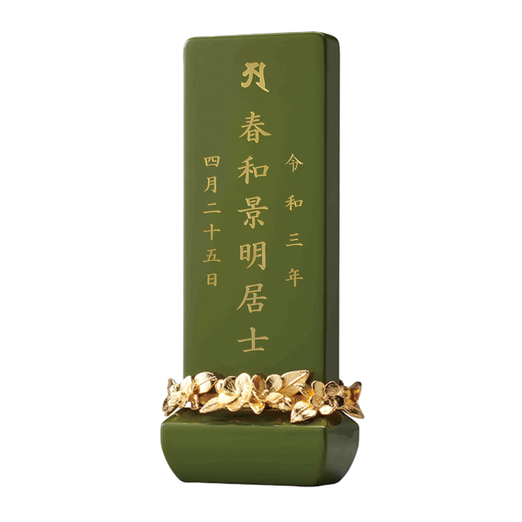 クラウン グリーン 4.5寸 ▼ 価格・仕様を見る 画像をクリックすると切り替わります 価格・仕様 商品名クラウン グリーン 4.5寸 価格(税込)¥106,700 サイズ (mm) W(幅) :62 D(奥行き) :36 H(高さ) :166 材質ヒバ 真鍮 仕上ウレタン塗装漆仕上 金メッキ 製造国日本製 華やかなモダン位牌。かわいい花飾りが高級感を演出するおしゃれなデザインです。夫婦位牌にできるのでミニ仏壇や小さい手元供養にも最適です。名入れを別途承ります。 文字入れもセットでご注文ください 文字入れの詳細はこちら ページの先頭へ 関連商品 わたゆき・ブルー 仏具・神具 ¥31,900 光の歌 ミニ骨壺・コアボトル ¥60,500 ヴェネツィアン フォトフレーム VP-003SS 写真立て・フォトフレーム ¥9,900
