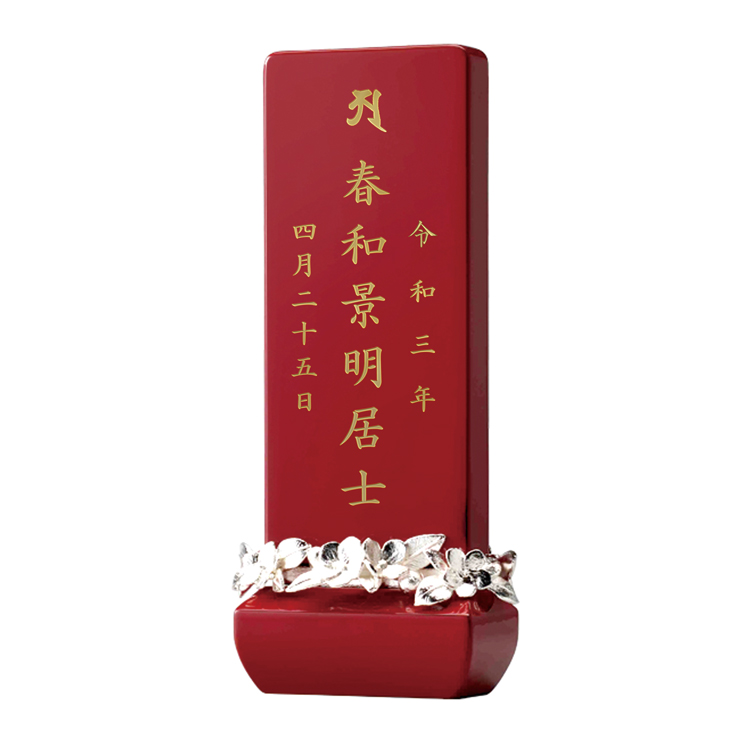 クラウン レッド 4.5寸 ▼ 価格・仕様を見る 画像をクリックすると切り替わります 価格・仕様 商品名クラウン レッド 4.5寸 価格(税込)¥106,700 サイズ (mm) W(幅) :62 D(奥行き) :36 H(高さ) :166 材質ヒバ 真鍮 仕上ウレタン塗装漆仕上 銀メッキ 製造国日本製 華やかなモダン位牌。かわいい花飾りが高級感を演出するおしゃれなデザインです。夫婦位牌にできるのでミニ仏壇や小さい手元供養にも最適です。名入れを別途承ります。 文字入れもセットでご注文ください 文字入れの詳細はこちら ページの先頭へ 関連商品 自在掛軸 三幅セット ウォールナット 掛軸 ¥115,500 バース・シルバーS 仏具・神具 ¥100,100 テゾーロ ブラック 4.0寸 位牌 ¥68,200