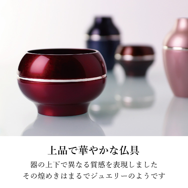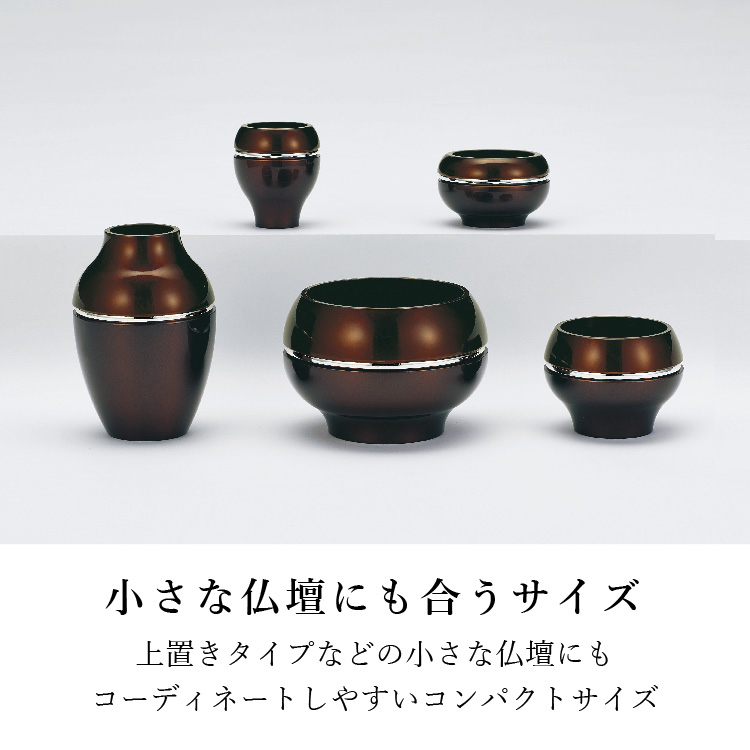 ソワレII・ブラウン ▼ 価格・仕様を見る 画像をクリックすると切り替わります 価格・仕様 商品名ソワレII・ブラウン 価格(税込)¥106,700 材質真鍮(銀メッキ) 備考クリスタルビーズ ローソク立て芯 フェルト オトシ(茶湯器 仏飯器)付 製造国日本製 質感を変えて表現した色の組み合わせがモダンな鋳物仏具。産地・高岡の技術が光る逸品です。 ページの先頭へ 関連商品 ホビット・イエロー 仏具・神具 ¥46,200 ローザ ミニ骨壺・コアボトル ¥82,500 クーシェ 4.5寸 位牌 ¥297,000