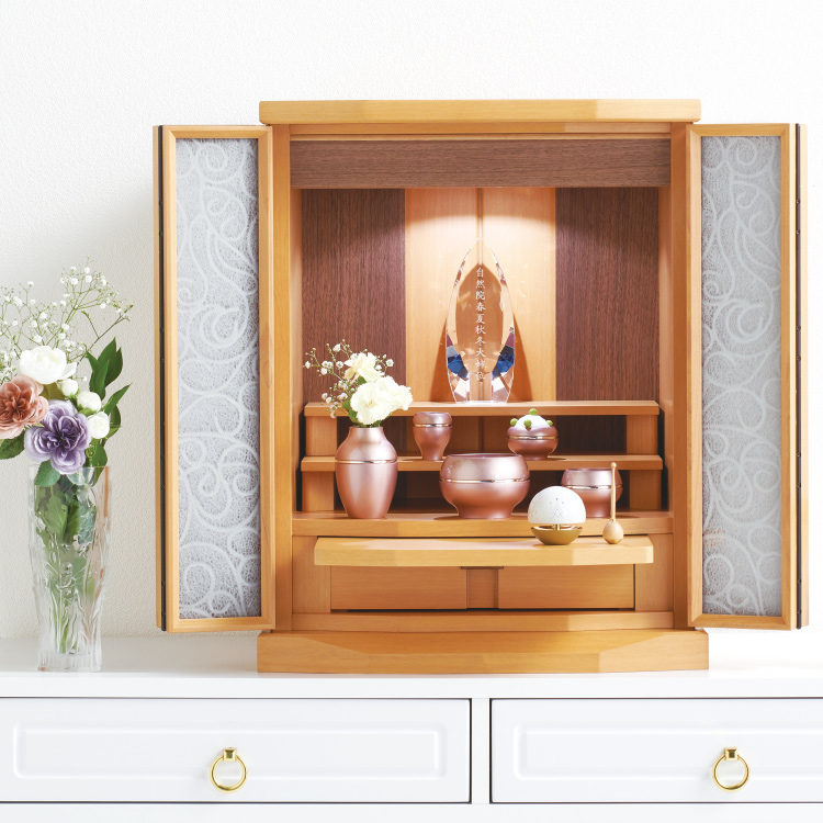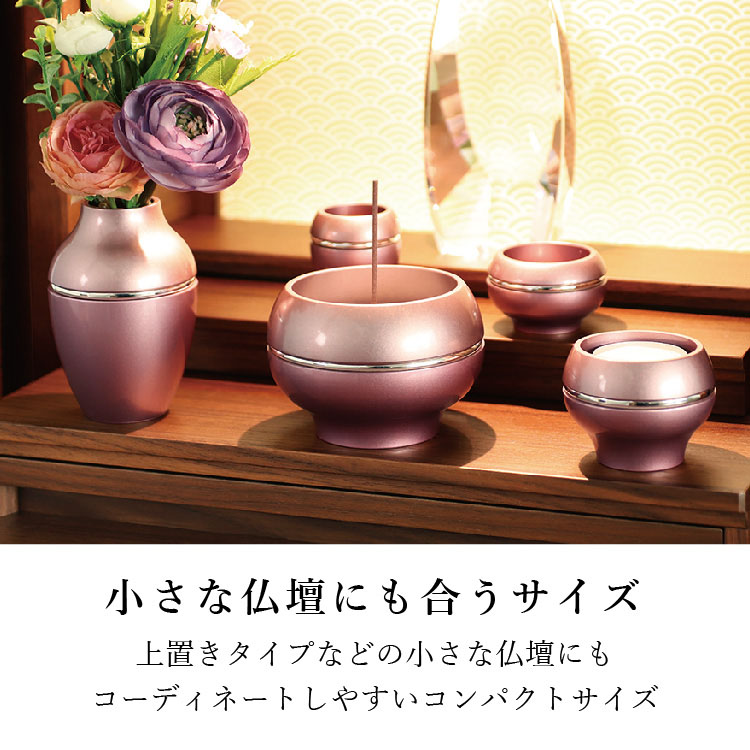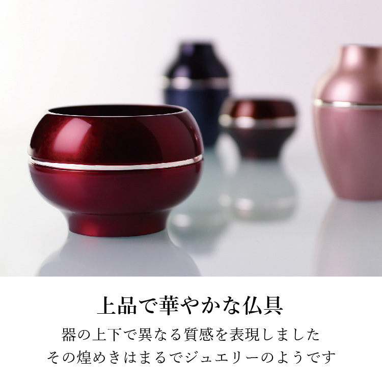 ソワレll・ピンク ▼ 価格・仕様を見る 画像をクリックすると切り替わります 価格・仕様 商品名ソワレll・ピンク 価格(税込)¥106,700 材質真鍮(銀メッキ) 備考クリスタルビーズ ローソク立て芯 フェルト オトシ(茶湯器 仏飯器)付 製造国日本製 質感を変えて表現した色の組み合わせがモダンな鋳物仏具。産地・高岡の技術が光る逸品です。 ページの先頭へ 関連商品 こくりこ ネイビー ミニ骨壺・コアボトル ¥19,800 クラウン ブラック 3.5寸 位牌 ¥91,300 森林香 トール 仏具・神具 ¥19,800