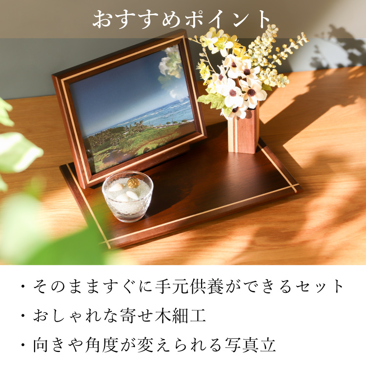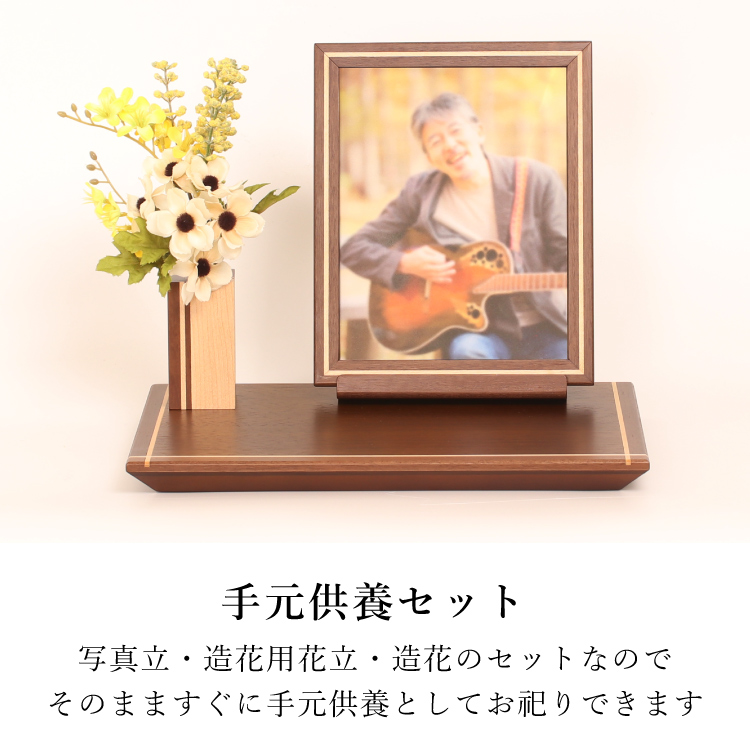 フィータ ダーク ▼ 価格・仕様を見る 画像をクリックすると切り替わります 価格・仕様 商品名フィータ ダーク 価格(税込)¥165,000 サイズ (mm) W(幅) :300 D(奥行き) :200 H(高さ) :240 重量約 2 kg 材質ウォールナット メープル アクリル 備考花立1ヶ 造花付 仕上ウレタン塗装 仕様・組立て式・花立は造花専用です 製造国日本製 寄せ木細工を取り入れたおしゃれでコンパクトなフォトフレーム付き仏壇。花立と造花が付属しているのでそのまますぐにお祀りできます。 ページの先頭へ 関連商品 ヒュースII ミディアム 上置き(コンパクト)仏壇 ¥60,500 オネスト ダーク 台付き(床置き)仏壇 ¥324,500 ミモザII 540 上置き(コンパクト)仏壇 ¥308,000