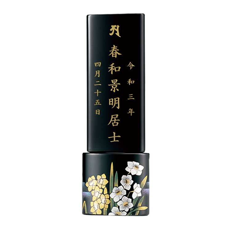 リベール 4.5寸 ▼ 価格・仕様を見る 画像をクリックすると切り替わります 価格・仕様 商品名リベール 4.5寸 価格(税込)¥242,000 サイズ (mm) W(幅) :68 D(奥行き) :38 H(高さ) :195 材質漆 ホオ ヒバ 仕上輪島塗布着せ本堅地呂色仕上 沈金 製造国日本製 おしゃれでモダンな輪島塗位牌。かわいい水仙に高級感が漂います。夫婦位牌にできるのでミニ仏壇や小さい手元供養にも最適です。名入れを別途承ります。 文字入れもセットでご注文ください 文字入れの詳細はこちら ページの先頭へ 関連商品 クアトロII S 仏具・神具 ¥51,700 ラフィカレッド 3.5寸 位牌 ¥26,400 花かご ミニ骨壺・コアボトル ¥25,300