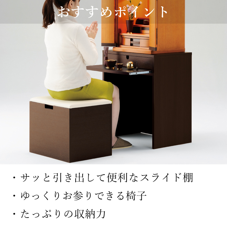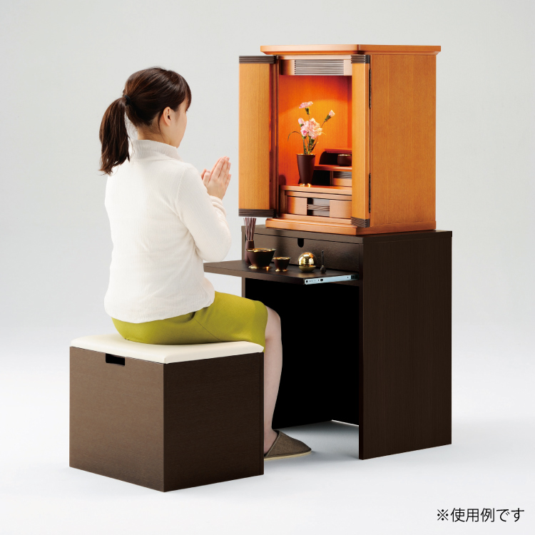 仏壇台 スペイスIII ダークブラウン ▼ 価格・仕様を見る 画像をクリックすると切り替わります 価格・仕様 商品名仏壇台 スペイスIII ダークブラウン 価格(税込)¥66,000 サイズ (mm) W(幅) :600 D(奥行き) :445 H(高さ) :700 重量約 19 kg 材質フラッシュ合板 ビニルレザー 仕上木目柄化粧板 製造国タイ製 椅子付きのモダンな仏壇専用台。お参りに便利なスライド棚と小物を収納できる引き出しを備え、椅子内部の収納空間に使わないものをすっきり片付けられます。 ページの先頭へ 関連商品 ソフトアルボン 小 お盆・盆提灯・お供物・仏花香炉灰・お手入・傷防止用品その他 ¥396 手元スイッチ その他 ¥1,870 ローソク球パック 2個セット その他 ¥726