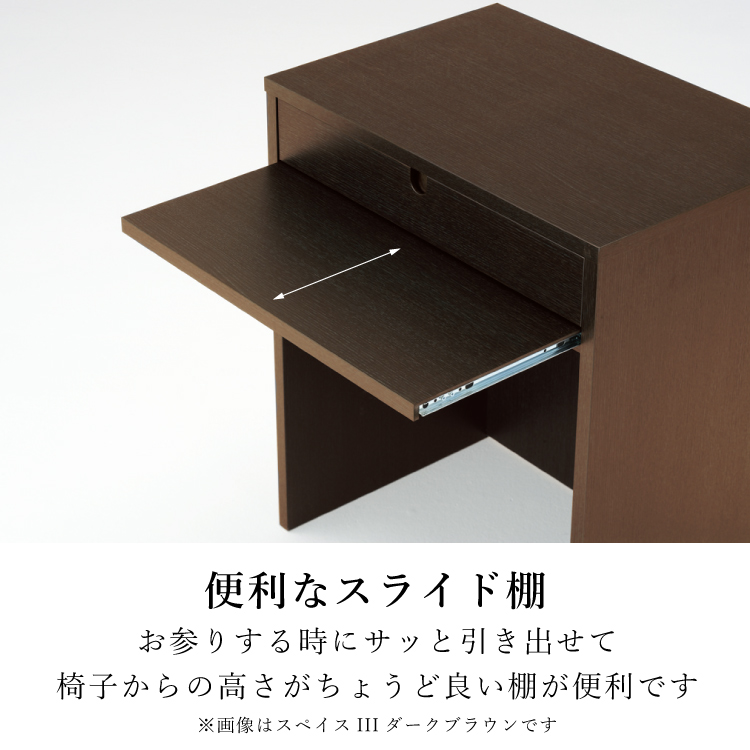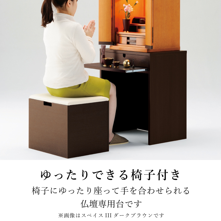 仏壇台 スペイスIII ブラウン ▼ 価格・仕様を見る 画像をクリックすると切り替わります 価格・仕様 商品名仏壇台 スペイスIII ブラウン 価格(税込)¥66,000 サイズ (mm) W(幅) :600 D(奥行き) :445 H(高さ) :700 重量約 19 kg 材質フラッシュ合板 ビニルレザー 仕上木目柄化粧板 製造国タイ製 椅子付きのモダンな仏壇専用台。お参りに便利なスライド棚と小物を収納できる引き出しを備え、椅子内部の収納空間に使わないものをすっきり片付けられます。 ページの先頭へ 関連商品 ソフトアルボン 小 お盆・盆提灯・お供物・仏花香炉灰・お手入・傷防止用品その他 ¥396 仏壇台 スペイスIII ダークブラウン 経机・仏壇専用台・椅子 仏壇専用台・経机 ¥66,000 仏壇台 スポットIII ダークブラウン 経机・仏壇専用台・椅子 仏壇専用台・経机 ¥49,500