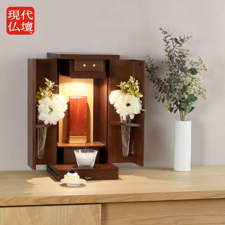 モダンな壁掛け仏壇です。コンパクトな薄型でリビングやマンションに溶け込み、おしゃれなインテリア空間を演出します。日本製ならではの精巧な格子扉が内と外の空間を優しくつなぎます。