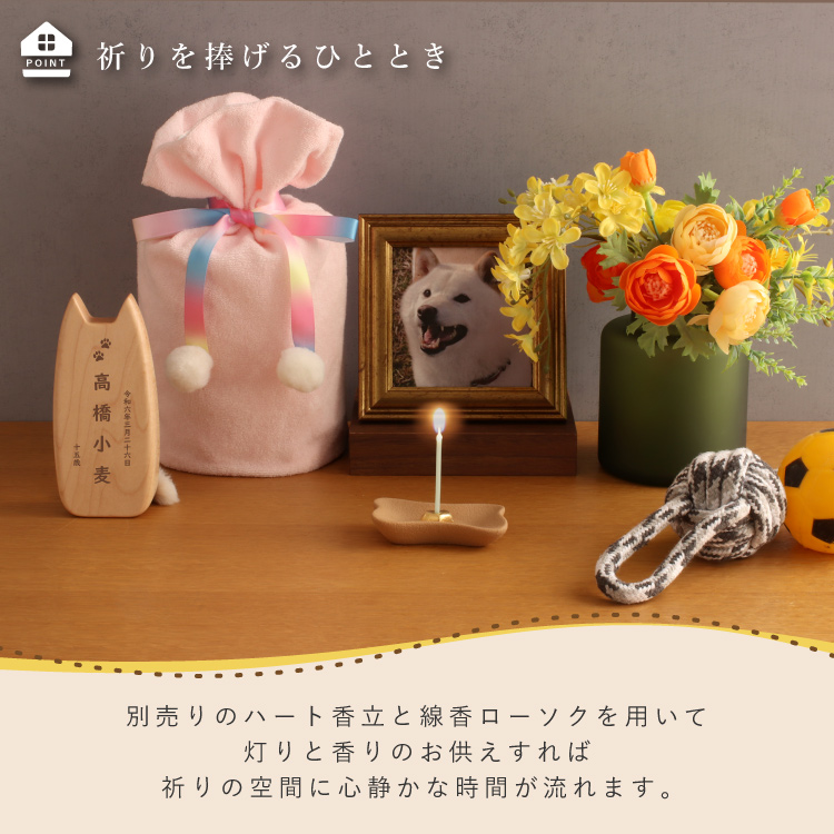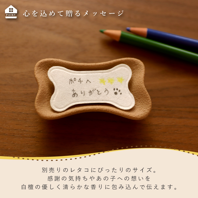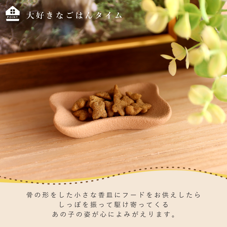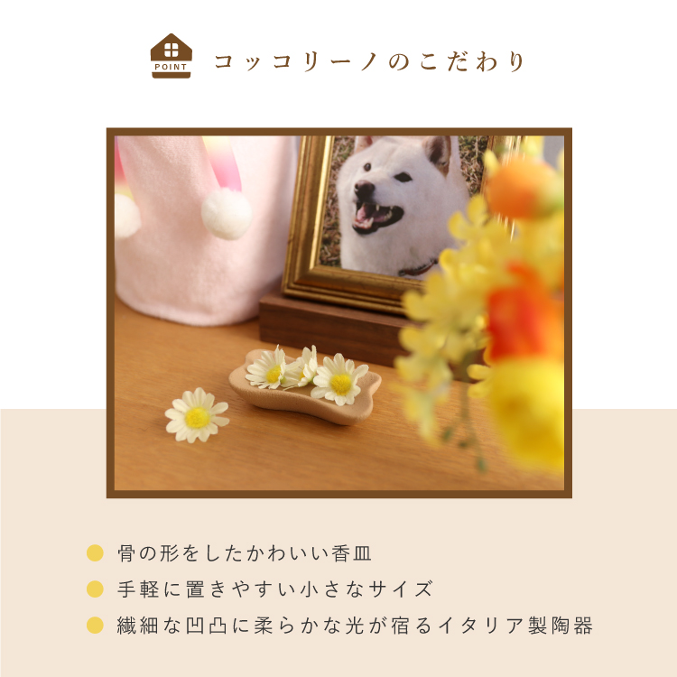 香皿【骨】キャメル ▼ 価格・仕様を見る 画像をクリックすると切り替わります 価格・仕様 商品名香皿【骨】キャメル 価格(税込)¥3,300 サイズ (mm) W(幅) :69 D(奥行き) :40 H(高さ) :15 材質陶器 備考付属品:フェルト 製造国イタリア製 骨の形をしたかわいい香皿。ペット用骨壺に付属している仏具を単品にしました。仏壇や祭壇にお供えしたりお香を焚いたりして供養することができます。 ページの先頭へ 関連商品 ワンチョA 本体:ホワイト 首輪:ハウス(ネイビー) ペット供養 ¥30,800 香皿【魚】ブラック ペット供養 ¥3,300 香皿【骨】グレー ペット供養 ¥3,300