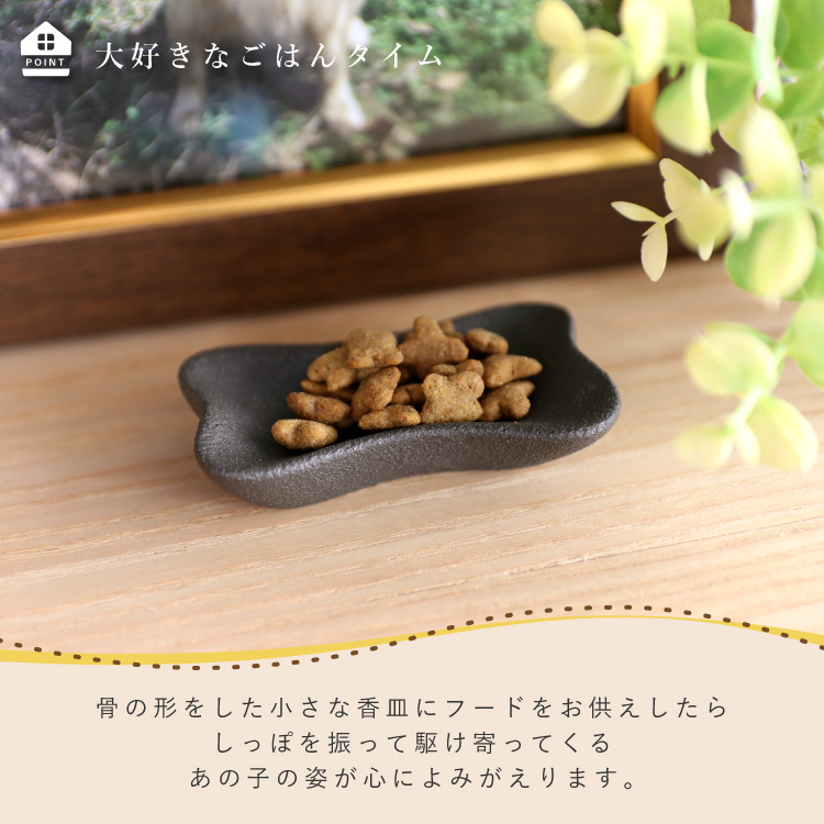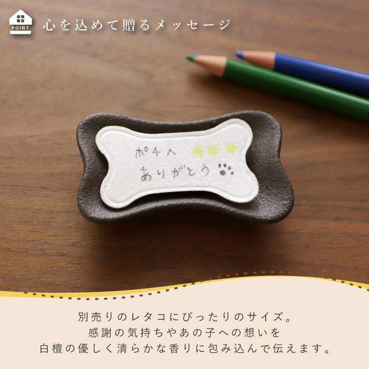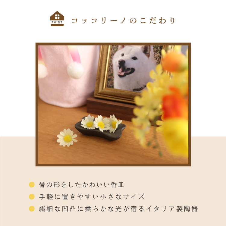 香皿【骨】ブラック ▼ 価格・仕様を見る 画像をクリックすると切り替わります 価格・仕様 商品名香皿【骨】ブラック 価格(税込)¥3,300 サイズ (mm) W(幅) :69 D(奥行き) :40 H(高さ) :15 材質陶器 備考付属品:フェルト 製造国イタリア製 骨の形をしたかわいい香皿。ペット用骨壺に付属している仏具を単品にしました。仏壇や祭壇にお供えしたりお香を焚いたりして供養することができます。 ページの先頭へ 関連商品 線香ローソク ペット供養 ¥1,375 テット ステージ ペット供養 ¥27,500 香皿【魚】キャメル ペット供養 ¥3,300