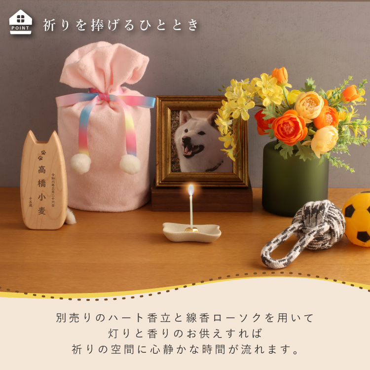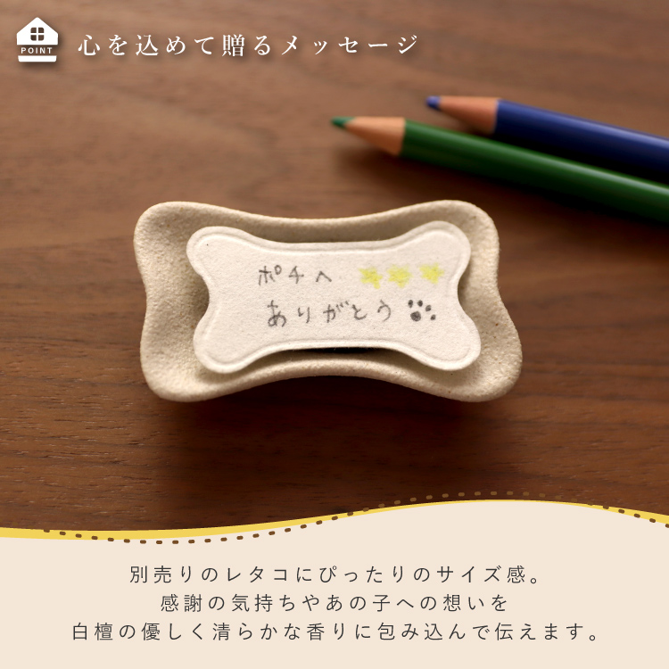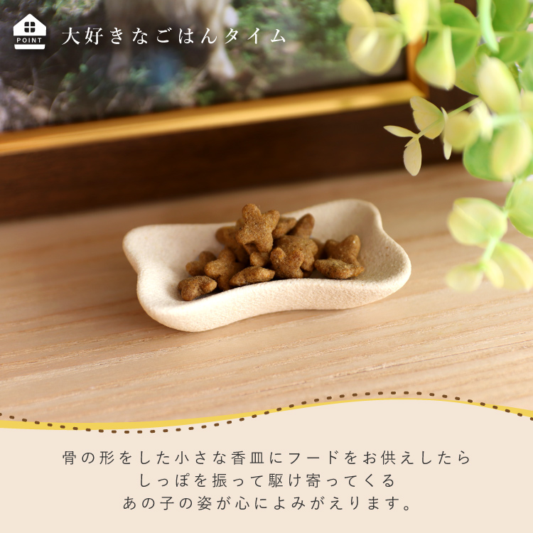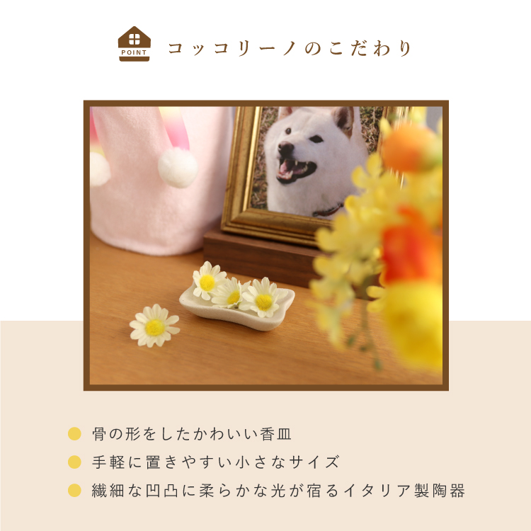 香皿【骨】ホワイト ▼ 価格・仕様を見る 画像をクリックすると切り替わります 価格・仕様 商品名香皿【骨】ホワイト 価格(税込)¥3,300 サイズ (mm) W(幅) :69 D(奥行き) :40 H(高さ) :15 材質陶器 備考付属品:フェルト 製造国イタリア製 骨の形をしたかわいい香皿。ペット用骨壺に付属している仏具を単品にしました。仏壇や祭壇にお供えしたりお香を焚いたりして供養することができます。 ページの先頭へ 関連商品 ハート香立て ペット供養 ¥935 プラート・ダーク ステージ ペット供養 ¥19,800 テット ステージ ペット供養 ¥27,500