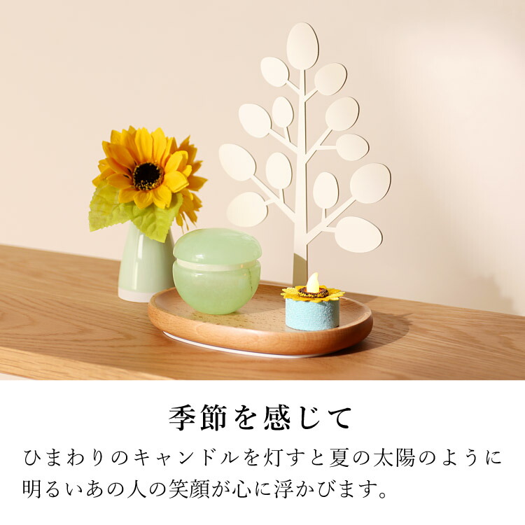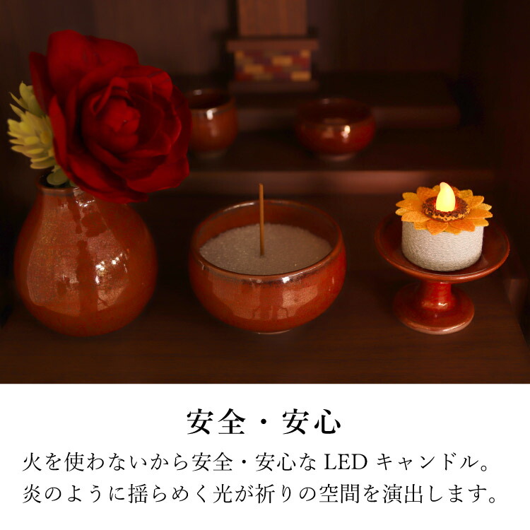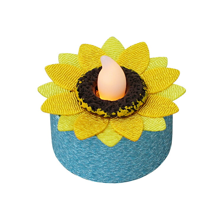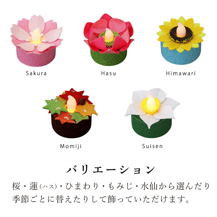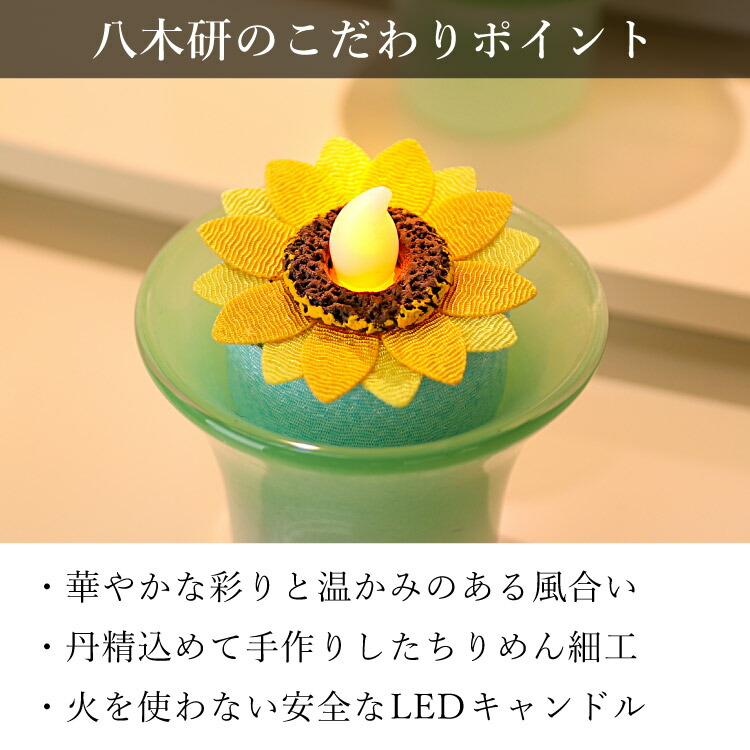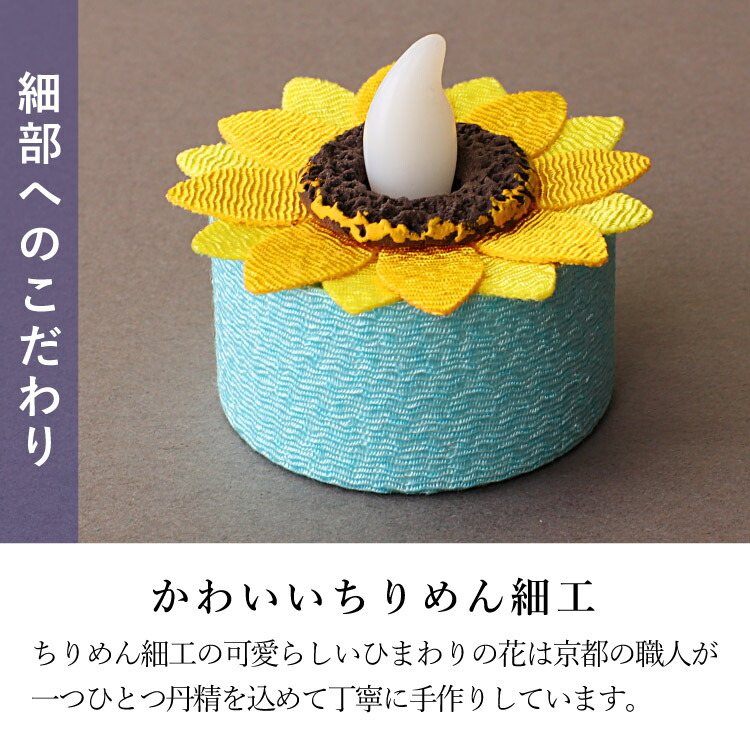 ちりめんキャンドル Himawari LED ▼ 価格・仕様を見る 画像をクリックすると切り替わります 価格・仕様 商品名ちりめんキャンドル Himawari LED 価格(税込)¥2,310 サイズ (mm) W(幅) :50 D(奥行き) :50 H(高さ) :41 材質縮緬 備考テスト用電池(CR2032 1個)付 照明LEDキャンドル(連続点灯約30時間) 仕様コードレス 製造国日本製 電池式LEDろうそくです。ちりめん細工で手作りした日本製のかわいい花が光ります。コードレスで小さいから場所をとらず、仏壇の灯りとしてお盆やお彼岸、季節の移ろいを演出します。 ページの先頭へ 関連商品 宝珠 ブルー 3.5寸 位牌 ¥91,300 白波 高坏 S 念珠・その他仏具 ¥6,050 空 念珠・その他仏具 ¥8,250
