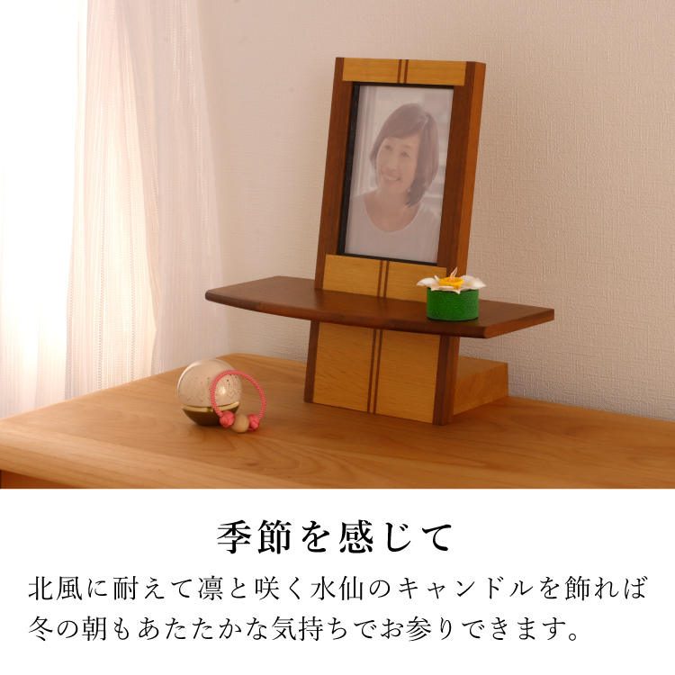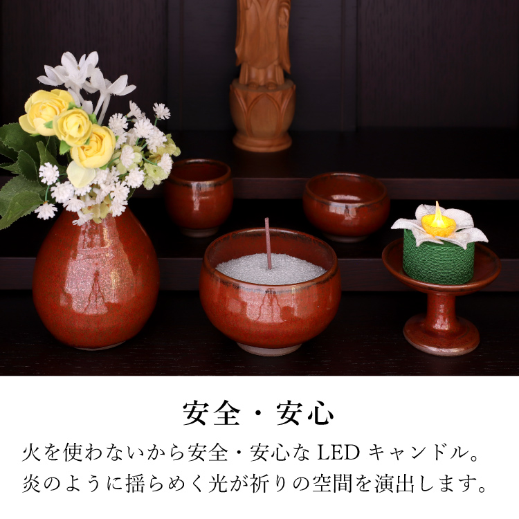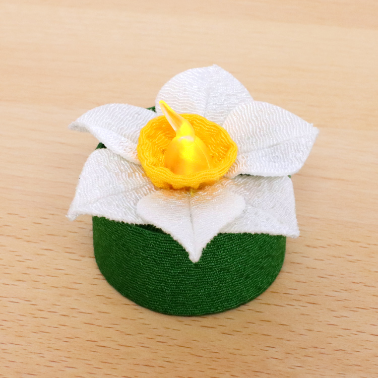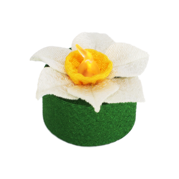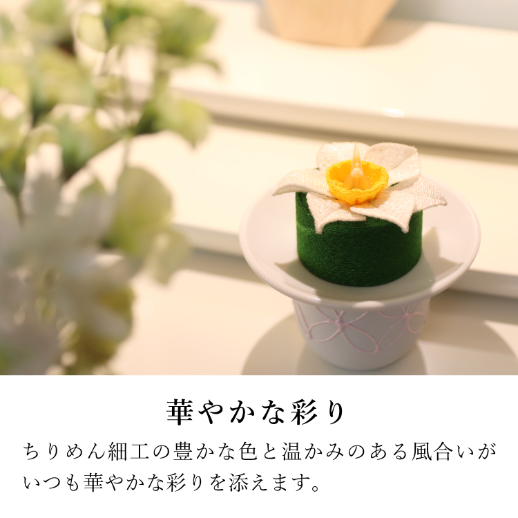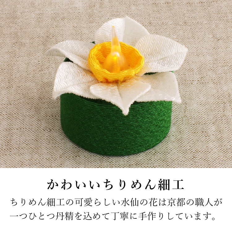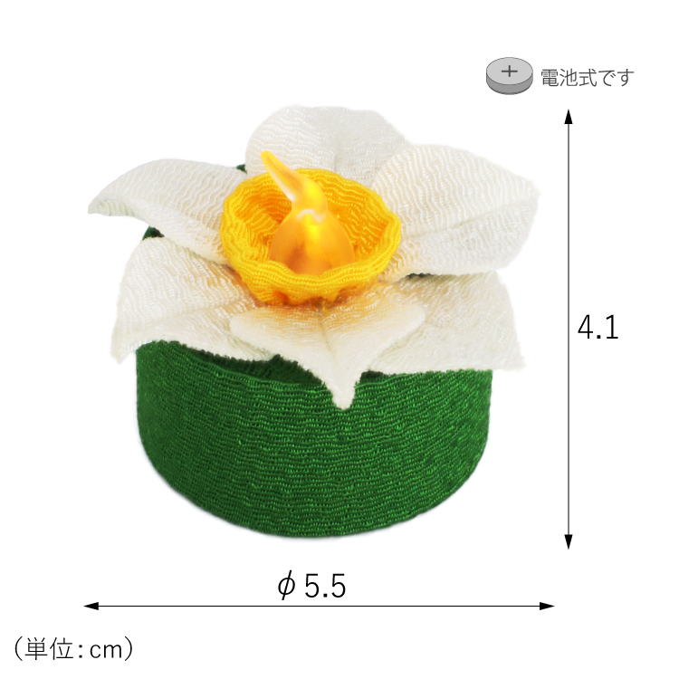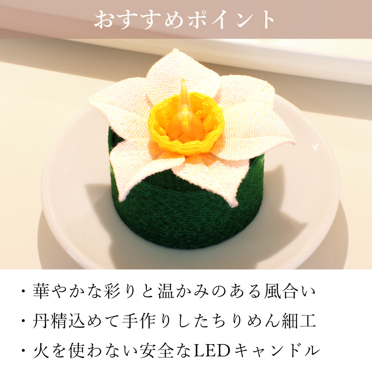 ちりめんキャンドル Suisen LED ▼ 価格・仕様を見る 画像をクリックすると切り替わります 価格・仕様 商品名ちりめんキャンドル Suisen LED 価格(税込)¥2,310 サイズ (mm) W(幅) :55 D(奥行き) :55 H(高さ) :41 材質縮緬 備考テスト用電池(CR2032 1個)付 照明LEDキャンドル(連続点灯約30時間) 仕様コードレス 製造国日本製 電池式LEDろうそくです。ちりめん細工で手作りした日本製のかわいい花が光ります。コードレスで小さいから場所をとらず、仏壇の灯りとしてお盆やお彼岸、季節の移ろいを演出します。 ページの先頭へ 関連商品 クラウン グリーン 4.5寸 位牌 ¥106,700 メモリアルフラワーmini パープルダイヤ お盆・盆提灯・お供物・仏花 ¥2,750 ヴェネツィアン フォトフレーム VP-002SS 写真立て・フォトフレーム ¥9,900
