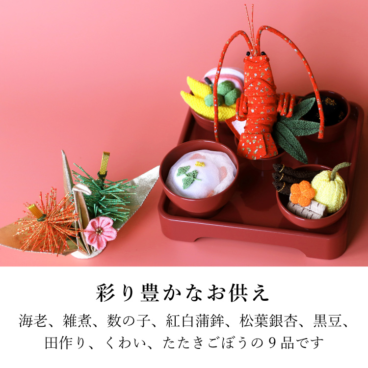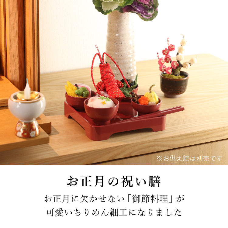 ちりめん飾り 御節料理 ▼ 価格・仕様を見る ※お供え膳は別売りです。 画像をクリックすると切り替わります 価格・仕様 商品名ちりめん飾り 御節料理 価格(税込)¥6,600 材質縮緬 製造国日本製 ちりめん細工のおせち料理。ミニ伊勢海老やかわいい梅花人参など、御節料理をご先祖さまにお供えできます。京都の職人が丁寧に手作りした日本製だから安心の品質です。 ページの先頭へ 関連商品 はなあかりグリーン お盆・盆提灯・お供物・仏花 ¥34,100 フィーロII・グリーン トール 仏具・神具 ¥13,200 山ノ辺 4.0寸 位牌 ¥88,000