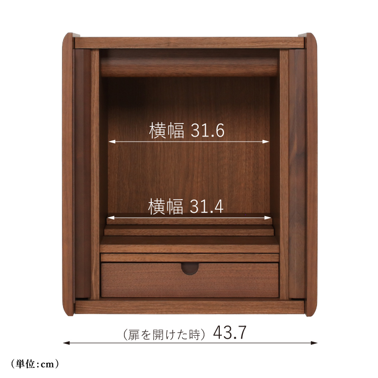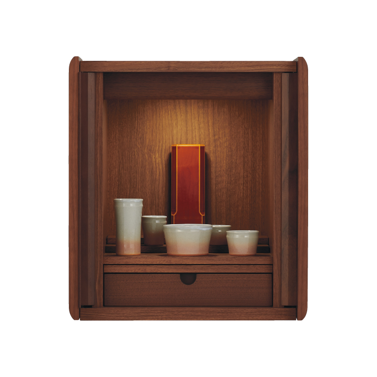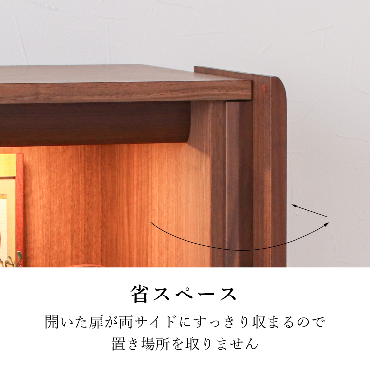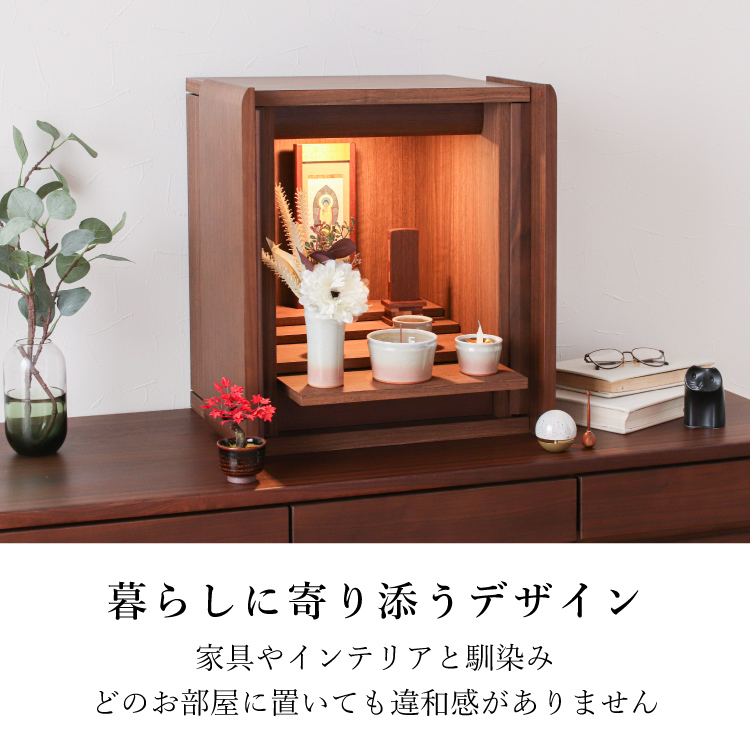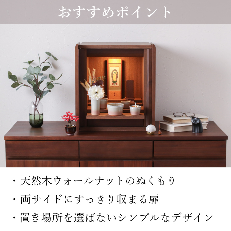 おしゃれなモダン仏壇です。扉が両側に収まるコンパクトな上置き仏壇なのでリビングやマンションに置きやすく、場所を選ばないシンプルなデザイン。日本製の確かな品質で安心です。
