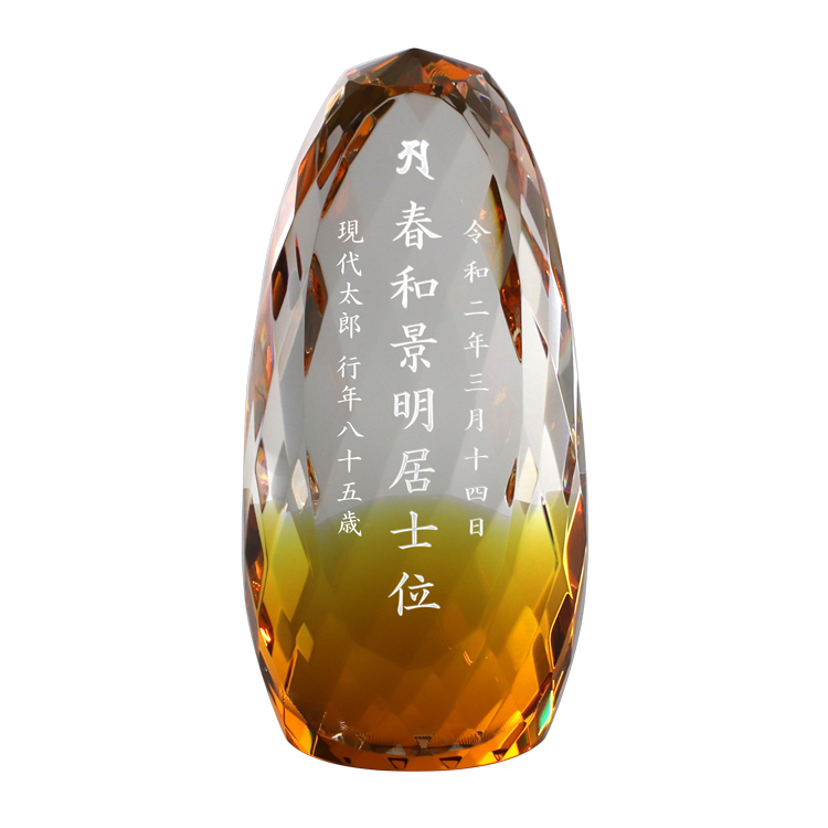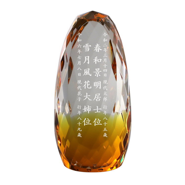 エリプス アンバー ▼ 価格・仕様を見る 画像をクリックすると切り替わります 価格・仕様 商品名エリプス アンバー 価格(税込)¥45,650 サイズ (mm) W(幅) :70 D(奥行き) :68 H(高さ) :150 材質光学ガラス 製造国中国製 モダンなガラス位牌です。角度によってきらめく光がおしゃれ。仏壇に合わせやすいのでミニ仏壇や小さい手元供養にもおすすめです。名入れを別途承ります。 文字入れもセットでご注文ください 文字入れの詳細はこちら ページの先頭へ 関連商品 exコースター チョコ その他 ¥1,650 クリスタルビーズ その他 ¥1,650 ヴェネツィアン フォトフレーム VP-001L 写真立て・フォトフレーム ¥29,150