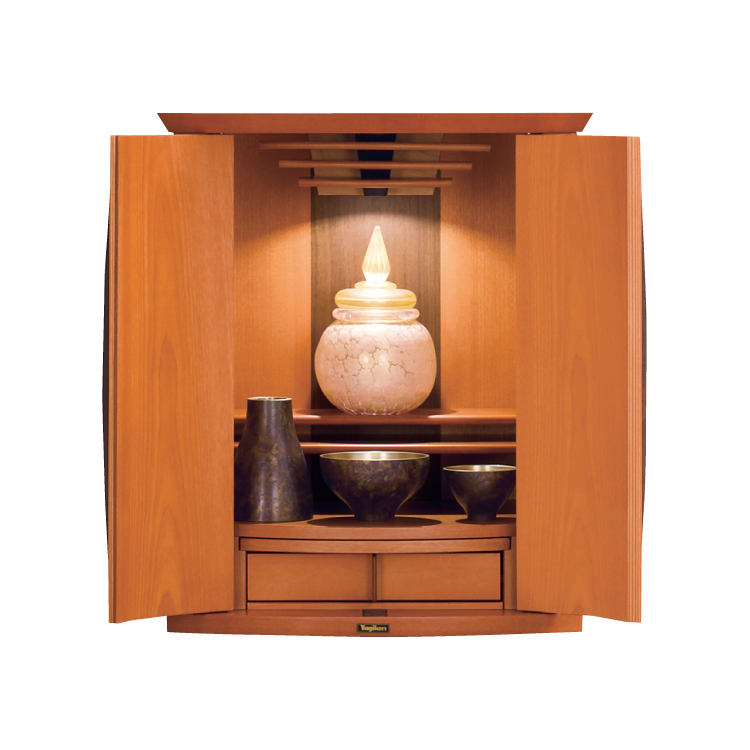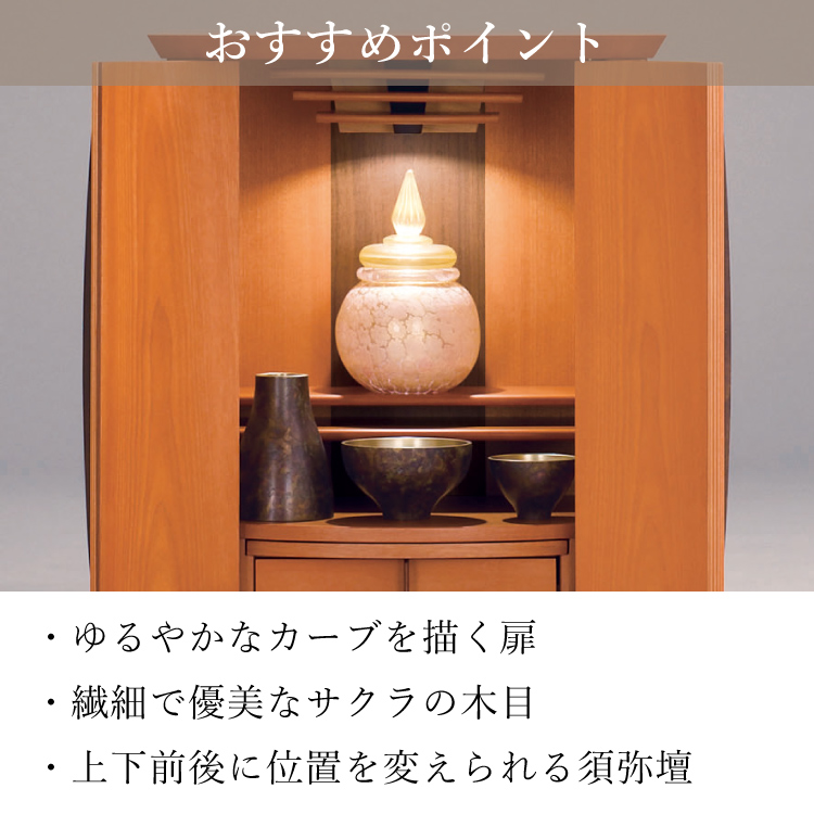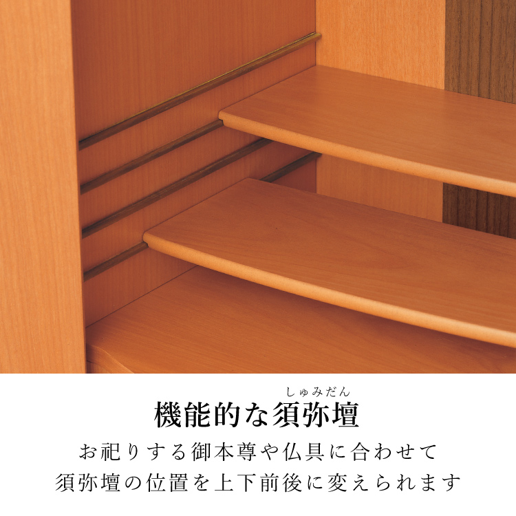 おしゃれなモダン仏壇です。リビングやマンションに置きやすいミニ仏壇。小さいながら日本製ならではの丁寧な作りでインテリアに馴染み、須弥壇は上下前後に位置を調整できます。