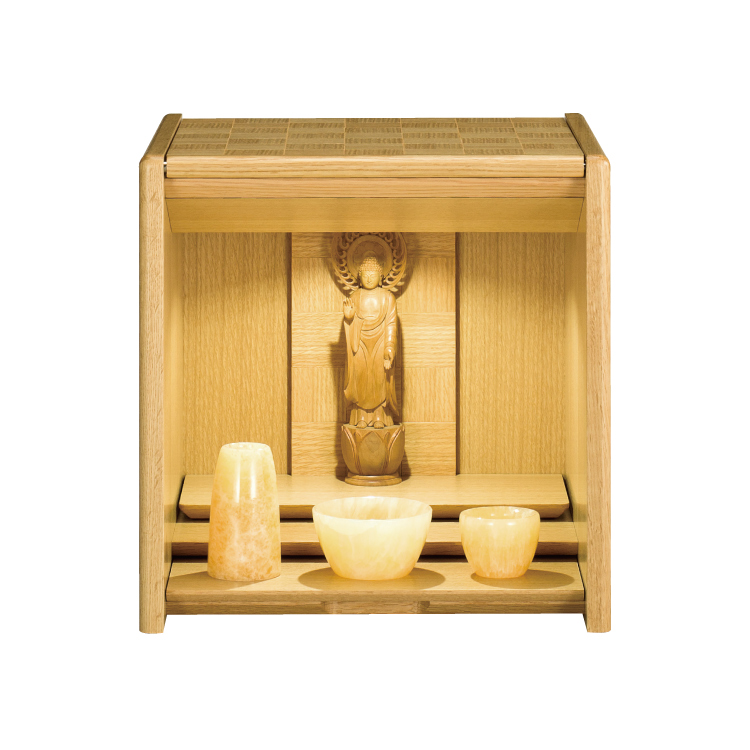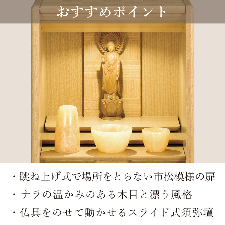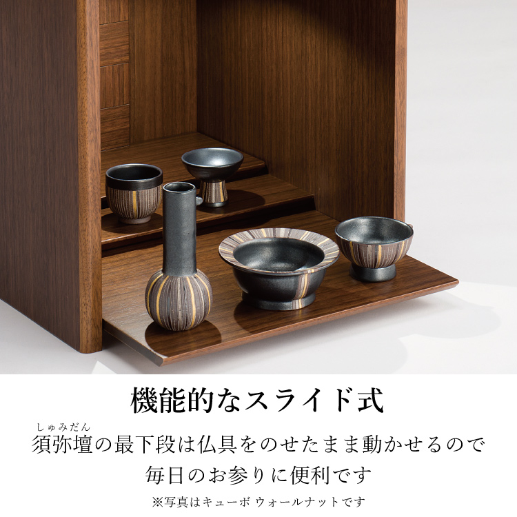 おしゃれなモダン仏壇です。リビングやマンションに置きやすいミニ仏壇。小さいながら日本製ならではの丁寧な作りで、天面に収まる扉と仏具をのせて動かせる須弥壇が便利です。