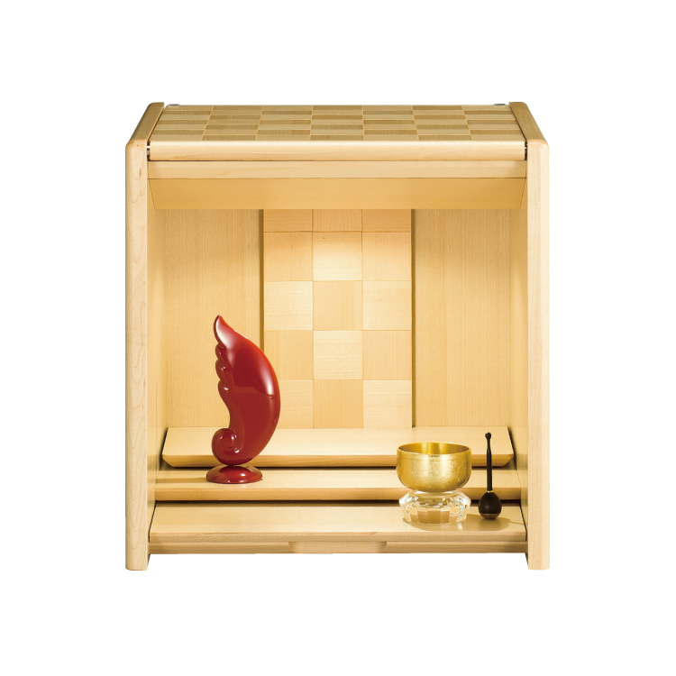 おしゃれなモダン仏壇です。リビングやマンションに置きやすいミニ仏壇。小さいながら日本製ならではの丁寧な作りで、天面に収まる扉と仏具をのせて動かせる須弥壇が便利です。