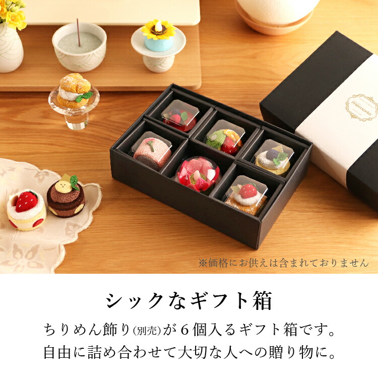 ギフト箱(ちりめん飾り 6個用) ▼ 価格・仕様を見る 画像をクリックすると切り替わります 価格・仕様 商品名ギフト箱(ちりめん飾り 6個用) 価格(税込)¥330 サイズ (mm) W(幅) :225 D(奥行き) :160 H(高さ) :60 材質紙 備考注意:必ず対象商品と一緒にご注文下さい。 製造国日本製 ちりめん飾りが6個入るギフトボックスです。別売りのちりめん細工を6つ選び、同じカートでお求めください。お盆や初盆、新盆、法事など年忌法要の贈り物やギフトにおすすめです。 ページの先頭へ 関連商品 エクレレ 青海波 盆提灯 お盆・盆提灯・お供物・仏花 ¥11,000 クラウン ブラック 3.5寸 位牌 ¥91,300 ちりめん飾り お彼岸御膳<春> お盆・盆提灯・お供物・仏花 ¥5,060