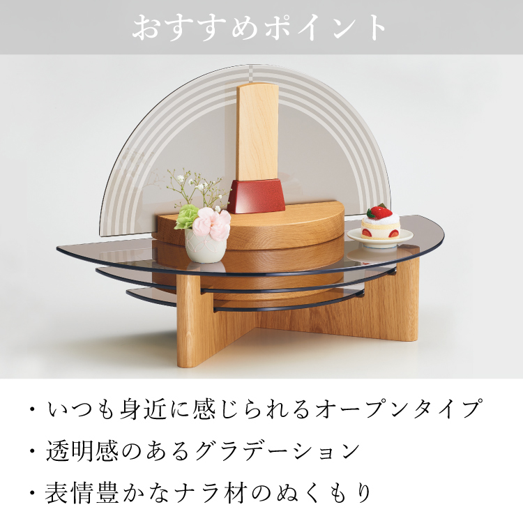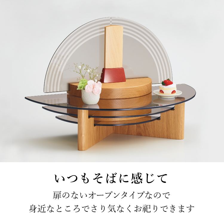 おしゃれなモダン仏壇です。小さいオープンタイプなのでリビングやマンションに置けて、ガラスの輝きが上質なインテリア空間を演出します。シンプルにお祀りする手元供養にもおすすめ。