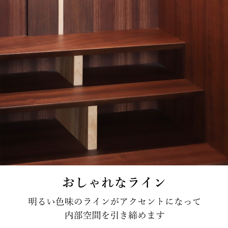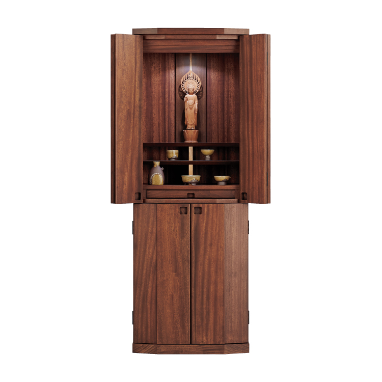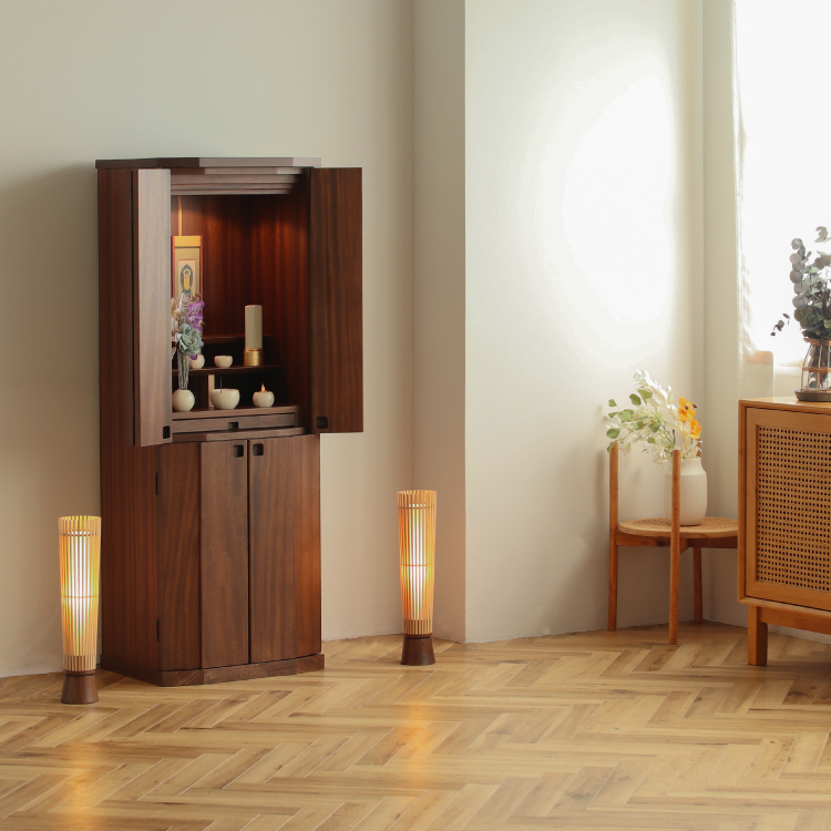 おしゃれなモダン仏壇です。シンプルなのでリビングやマンションに置きやすく、和室にも合います。日本製ならではの丁寧な作りでクスノキの無垢材を四つ葉のイメージで彫り込みました。