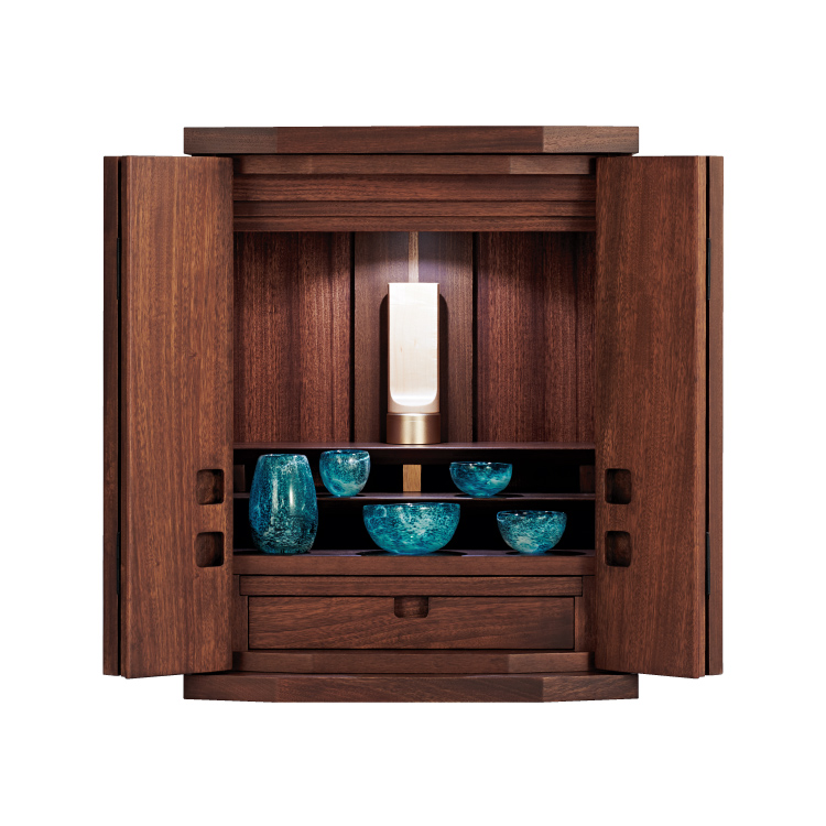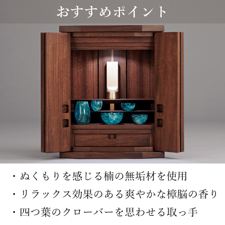 おしゃれなモダン仏壇です。日本製ならではの丁寧な作りでクスノキの無垢材を四つ葉のイメージで彫り込みました。上置き仏壇なのでリビングやマンションのインテリア空間に馴染みます。