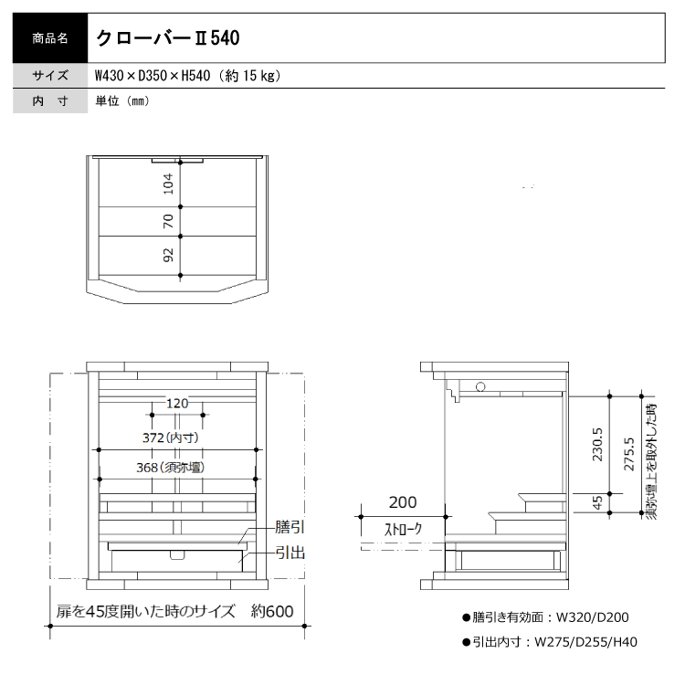 W(幅) :430 D(奥行き) :350 H(高さ) :540
