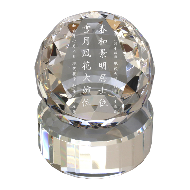 グローヴ ▼ 価格・仕様を見る 画像をクリックすると切り替わります 価格・仕様 商品名グローヴ 価格(税込)¥38,500 サイズ (mm) W(幅) :90 D(奥行き) :90 H(高さ) :115 材質光学ガラス 製造国中国製 モダンなガラス位牌です。角度によってきらめく光がおしゃれ。仏壇に合わせやすいのでミニ仏壇や小さい手元供養にもおすすめです。名入れを別途承ります。 文字入れもセットでご注文ください 文字入れの詳細はこちら ページの先頭へ 関連商品 メンヒ 4.0寸 位牌 ¥49,500 メモリアルフラワー 麗II お盆・盆提灯・お供物・仏花 ¥3,300 メモリアルフラワー 凛 お盆・盆提灯・お供物・仏花 ¥4,730
