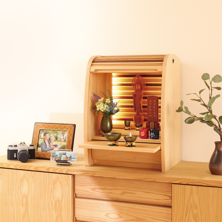 おしゃれなモダン仏壇。コンパクトな上置き仏壇なのでリビングやマンションに置きやすく、日本製ならではの丁寧な作りで10種類の無垢材を組み合わせてじゃばら扉を仕上げました。