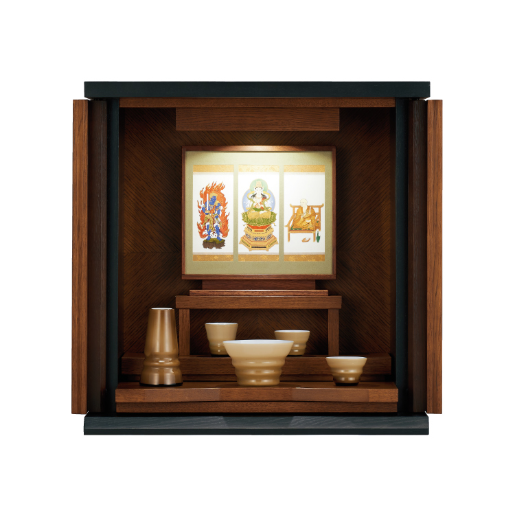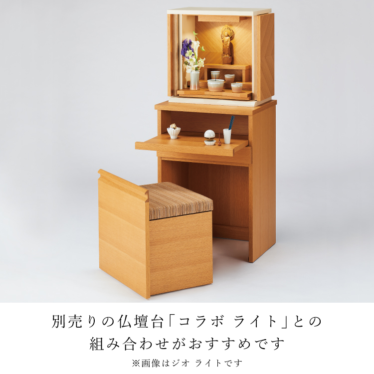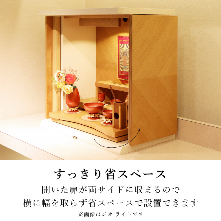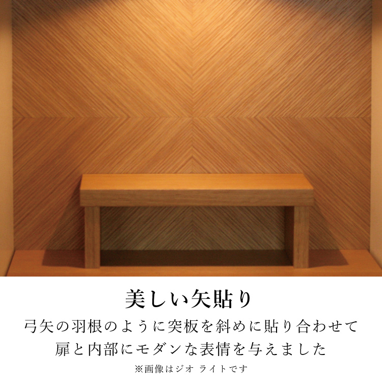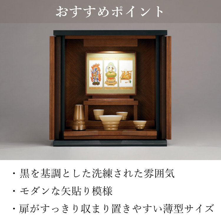 矢貼り模様がおしゃれなモダン仏壇です。扉は折り畳んで両側にぴったり収まるコンパクトな上置き仏壇なのでリビングやマンションに置きやすく、日本製ならではの丁寧な仕上がりです。